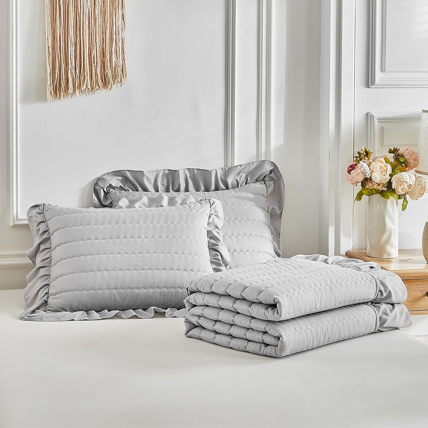 Ruffled Quilt Set Queen Size 92 * 92in - 3 Pieces Solid Shabby Chic Farmhouse Ruffles Stripes Waves Bedding Rustic Coverlet & Sets Lightweight Summer Boho Bedspread with Shams for Women Men - Gray