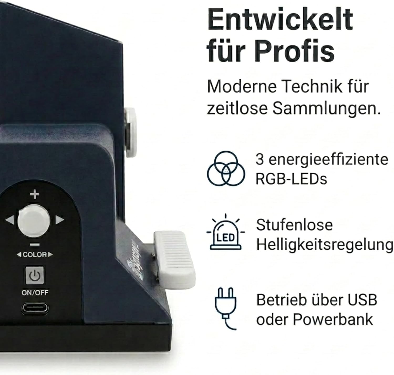 8 different colors and 3 different daytime running/white lights can be set as center exam lights. Colors can improve the result of the exam, by For example, by illuminating a red background stamp with red light and thus "neutralizing" the red printing ink that may appear on the reverse side of the stamp. The watermark, repair... are not altered by unwanted chromatic influences and stand out more clearly. The Signoscope is powered by 3 powerful RGB LEDs (= 9 LEDs), which save a lot of energy and hardly wear out. Continuous adjustment of the light intensity (+/-) allows for a optimal illumination of the respective brand, so maximum light irradiation does not necessarily lead to an optimal examination result. The device is supplied with a USB adapter and can therefore be connected to the mains power supply or, for example, to a computer with a USB port. For the mobile operation of the Signoscope PRO, we recommend our SAFE power bank no. 9894. It takes up very little space and the housing is made of aluminium. The capacity is 2600 mAh (not included in the delivery).