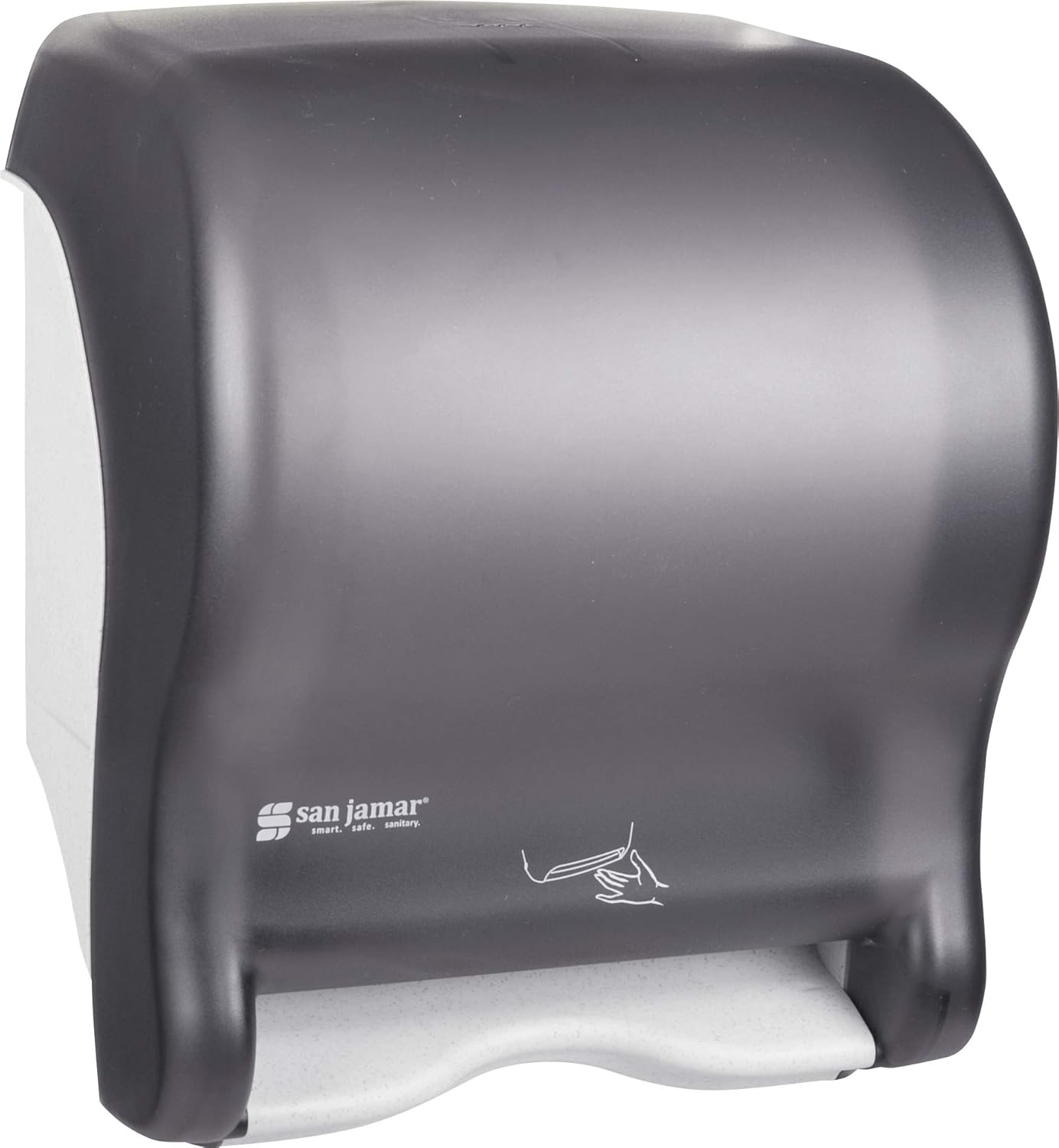 The San Jamar Classic Paper Towel Dispenser Smart Essense is an electronic roll towel dispenser designed for versatility and efficiency. Crafted from durable plastic and measuring 10 x 14.5 x 12.5 inches in black, this dispenser offers convenience for bathrooms, kitchens, and restaurants. Experience flexibility with its high-capacity design, accommodating any roll towel brand with adjustable lengths of 8”, 12”, or 16”, ensuring compatibility with your preferred towels. Customize your dispensing with adjustable paper delay settings, offering options for 1.5- or 3-second delay, or no delay for high-traffic areas, promoting efficient and tailored solutions. Easily adjust settings with the keypad for optimal usage, providing effortless customization whenever needed, enhancing user convenience. Rely on the durability of the transparent cover, made from impact-resistant plastic that is theft-proof and allows easy monitoring of roll status, ensuring both security and convenience. Save space with this compact design, up to 25% smaller than other electronic dispensers, making it perfect for tight spaces without compromising functionality. Whether in a busy kitchen or a bustling restroom, this automatic paper towel dispenser is a practical choice for efficient and convenient hand drying (Model Number:T8400TBK) .