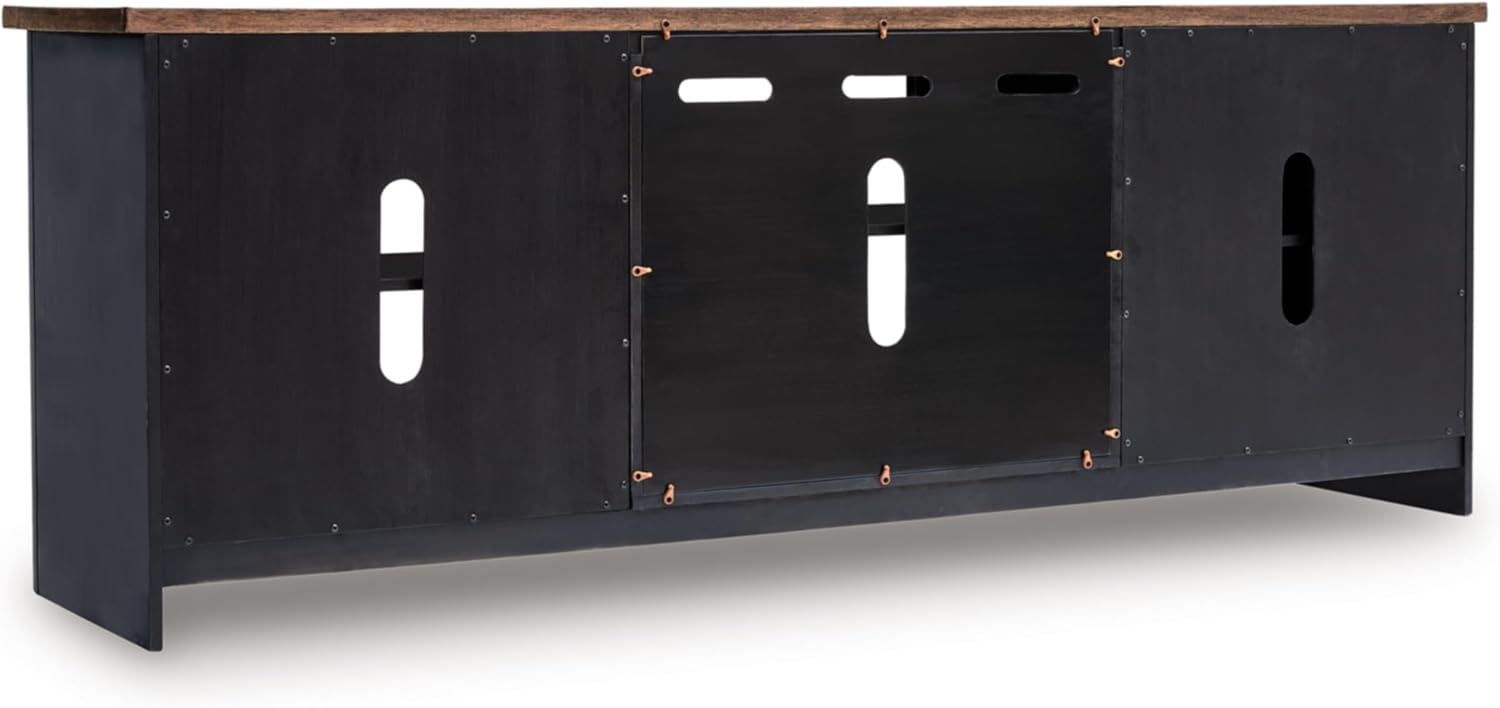 Raise the bar on modern farmhouse style with the Wildenauer TV stand. Its sturdy silhouette and casual good looks are accentuated with a two-tone finish, which pairs a warm satin black base with a contrasting butcher block veneer top. Glass door cabinets with adjustable shelves offer plenty of storage for media and electronics. And removing the center cabinet’s shelf allows room for the optional fireplace insert (sold separately), adding instant warmth and romance. Whether your style is vintage, country or eclectic, this TV stand adds a hearty element.
