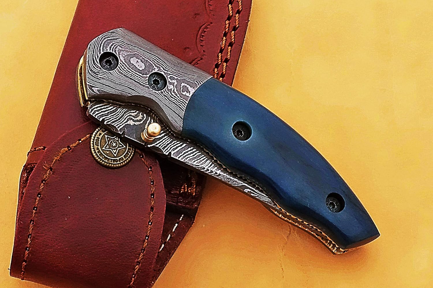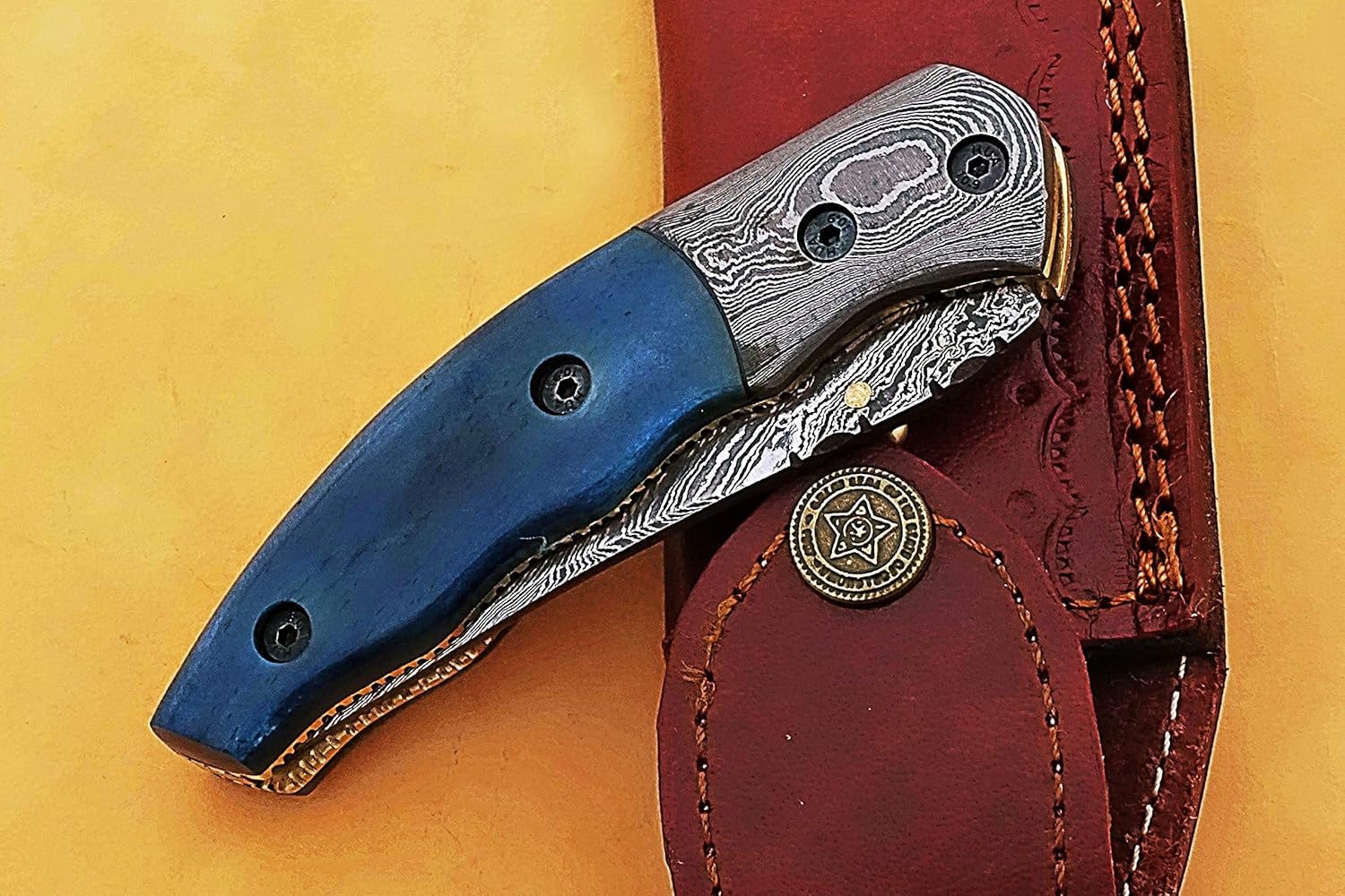 Custom made Damascus Steel Bowie Knife. Full Length 7.5-inches, Blade 3-Inches, Handle 4.5-Inches. Handle made of Blue Color Bone and Bolster Made of Damascus Steel. Also this Product include Custom Made Real Cow Hide Sheath. The High Grade Damascus Steel Used For This Blade Consists Of Layers Of 1095 & 15N20 High Carbon Steels Mixture Welded, Forged & Hammered Several Times To Obtain Up To 416 Layers. Blade has been given excellent heat treatment to get The Hardness Of Up To 55 to 60 HRC On The Rockwell Scale Which Makes The Blade Durable and Razor Sharp. How To Care For Your New Knife: Store In A Dry Place, Moisture Encourages Rust After Use, Wash & Dry The Blade & Apply Vegetable Oil, OR Any Lubricating Oil after every use. Damascus Is Very Easy To Clean with WD40 if Rusted.