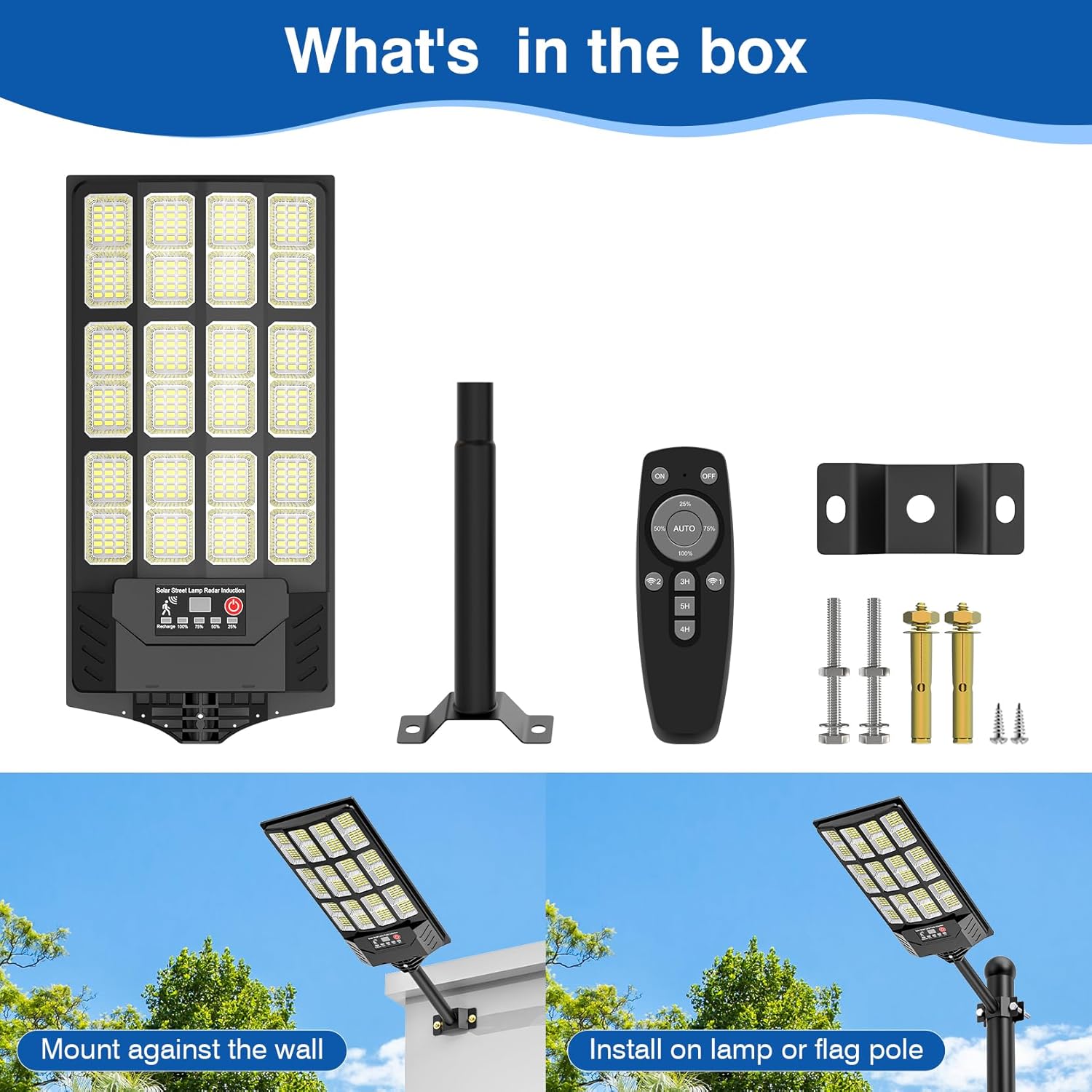 | Included Components | 1*Mounting bracket, 1*Set of mounting accessories, 1*Solar powered street light, Remote Control |