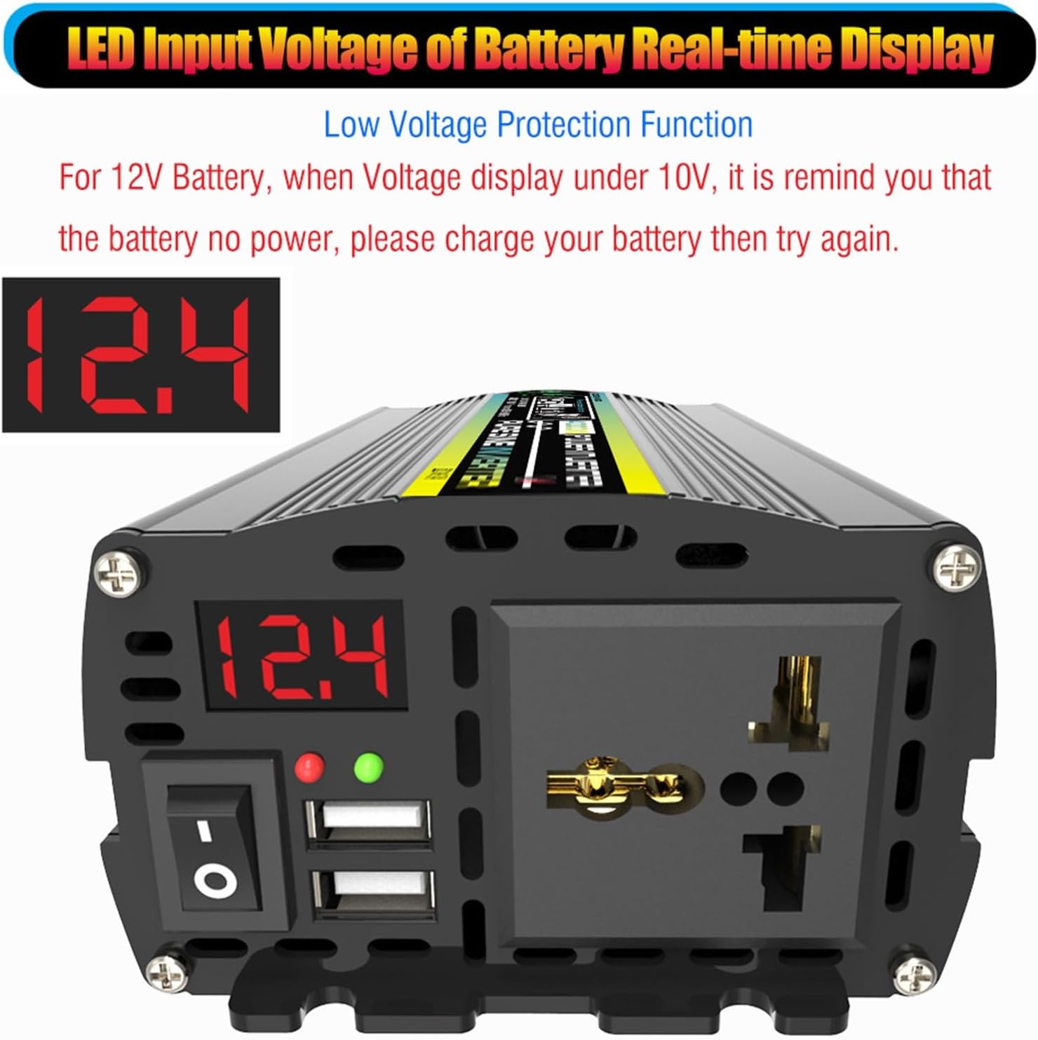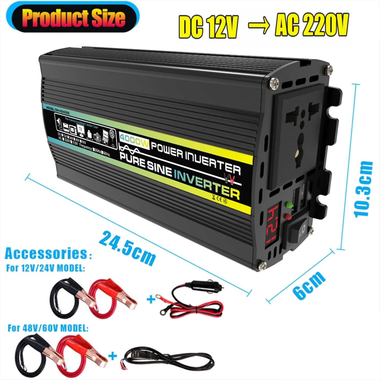 Specifications:Peak power: 3000W/4000WContinuous power: 500W/800WLED Red/green lights:Green work normal, red show on protectionsInput DC voltage (DC): DC 12VAC output voltage: 110V/220V ACFrequency: 50HzConversion efficiency: 90%Temperature protection: (45°C)The solar controller is a universal model with 50A 12V/24V voltage automatic identification.The solar panel is 80W18VSolar Panel: monocrystalline siliconSolar Panel WorkingVoltage: 18VSolar Panel Open Circuit Voltage: 21.6VSolar Panel Short Circuit Current: 1.11A (max)Output Port: dual USBProduct Features: integrated voltage regulator module, 5V dual USB voltage regulator outputPackage package:Independent packaging: inverter + solar controller + solar panelPackaging and accessories:1 inverter1 pair of red and black battery clips1 cigarette lighterEnglish inverter manuala solar controllerEnglish controller manualSolar panelsDC lineDC alligator clip