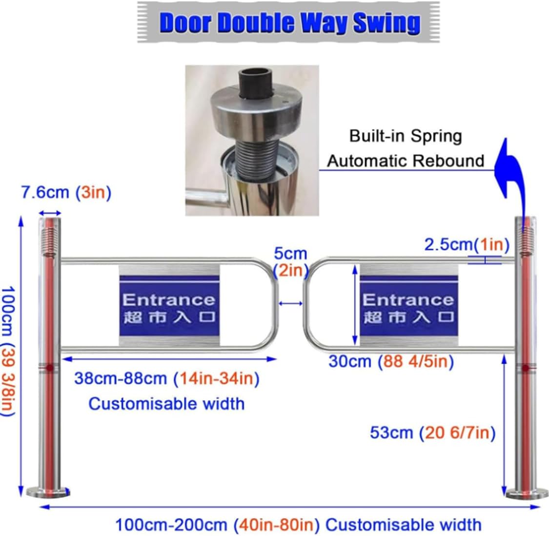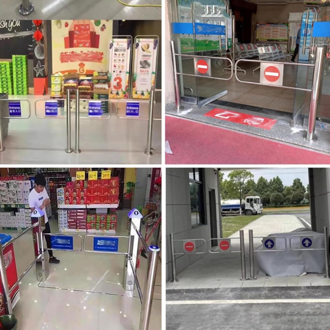 Introducing our Stainless Steel One-Way Revolving Door, designed for various applications including industrial environments, warehouses, shopping malls, and more. Crafted from high-quality 304 stainless steel, this door is not only waterproof and rust-proof but also highly durable and wear-resistant, making it perfect for high-traffic areas.**Core Features**- **One-Way Entry**: This innovative design ensures one-way traffic flow, automatically closing after entry to prevent reverse movement, ideal for controlled access areas.- **Robust Construction**: With an all-stainless steel structure, this door is highly impact-resistant and suitable for frequent use in locations like warehouses and shopping centers.- **Automatic Rebound Mechanism**: Equipped with a built-in high-elasticity spring, the door opens effortlessly with a gentle push and closes automatically, requiring no electricity for operation.- **Safety and Stability**: The door features a secure bottom expansion screw for anti-dumping protection and excellent load-bearing capacity.- **Customizable Width**: The channel width is adjustable from 100-200cm (40-80 inches), catering to various entry requirements such as supermarket entrances and logistics pathways.**Ideal Usage Scenarios**- Industrial warehouse logistics- Supermarket and shopping mall entrances- Public venues including subway stations and libraries- Security inspection zones requiring controlled access**Package Includes**- One-way revolving door body (with pre-installed spring system)- Installation accessories package (including expansion screws)*Note: Display racks and other non-standard accessories must be purchased separately.*