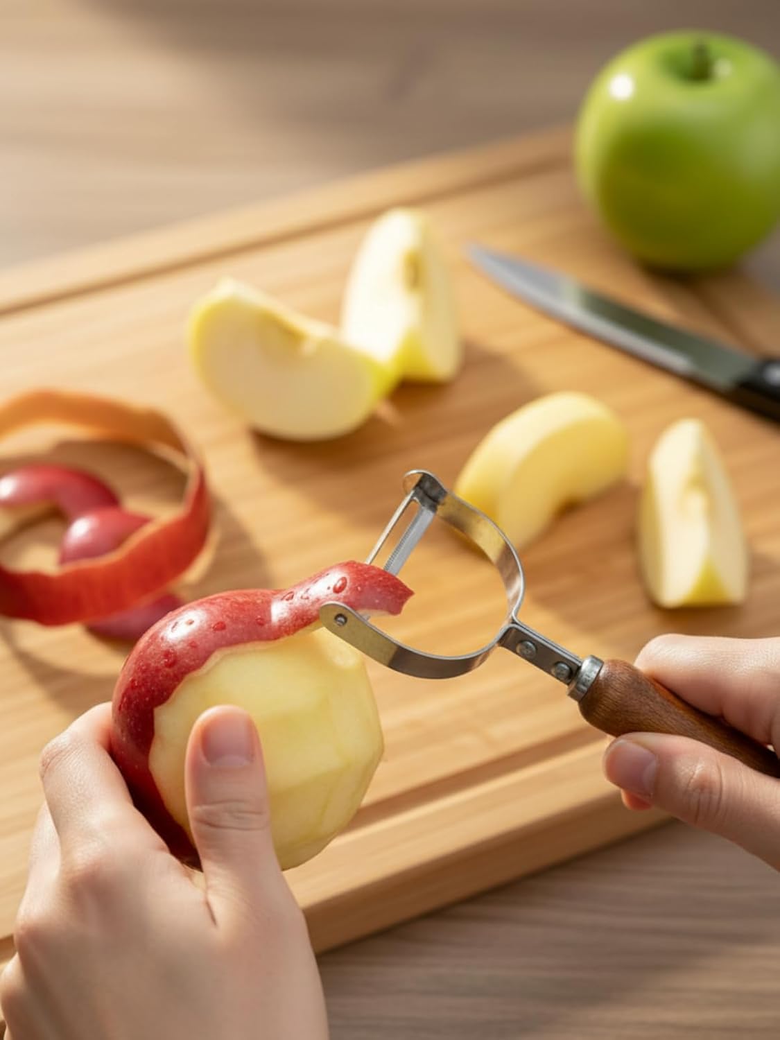 Transform your fruit and vegetable preparation with this premium stainless steel peeler featuring an elegant wooden handle. The curved swivel blade design allows for smooth, precise peeling of various produce like apples, potatoes, carrots, and more. The ergonomic wooden handle provides a comfortable, secure grip while the durable stainless steel construction ensures long-lasting performance. Perfect for both professional and home kitchens, this versatile tool makes quick work of peeling tasks with its sharp blade that follows the natural contours of your fruits and vegetables. The classic design combines functionality with style, while the sturdy construction means this peeler will be a reliable kitchen companion for years to come. The peeler's efficient design minimizes waste while maintaining speed and precision in your food prep routine. Keep your kitchen equipped with this essential tool that makes peeling tasks easier and more enjoyable.