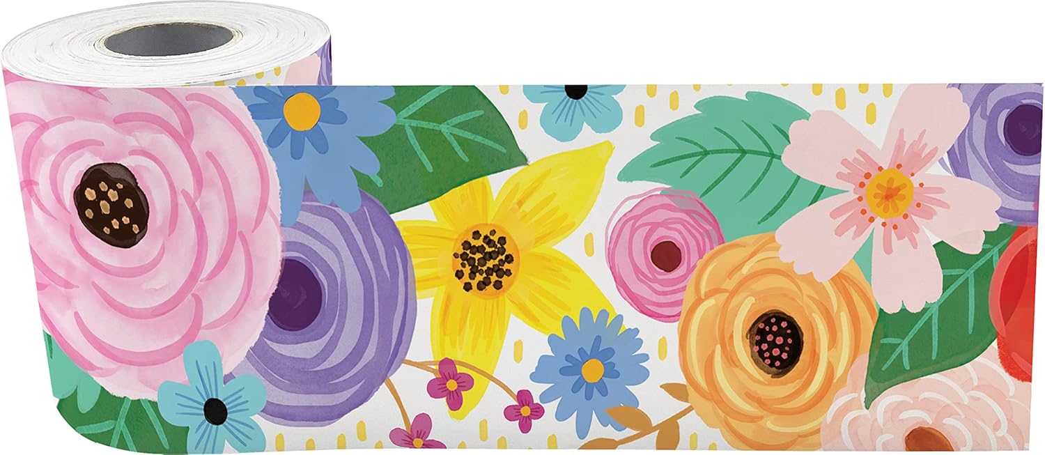 Teacher Created Resources Navy Blue Better Than Paper Bulletin Board RollThis revolutionary non-woven fabric makes creating beautiful bulletin board backdrops quick and easy! The lightweight material is simple to hang—no more struggling with paper that wrinkles and tears. Attach border trim, accents, posters, and student work with staples or tape and remove without ripping or leaving conspicuous holes. The durable write-on/wipe-off surface is easy to clean and can be wiped-down or sprayed with disinfectant to help prevent the spread of germs. Roll measures 4' x 12'.Teacher Created Resources Wildflowers Straight Rolled Border Trim - 50ft - Decorate Bulletin Boards, Walls, Desks, Windows, Doors, Lockers, Schools, Classrooms, Homeschool & Offices50 foot continuous roll of vibrant border trim made of durable paper. Cut each border to your desired length.