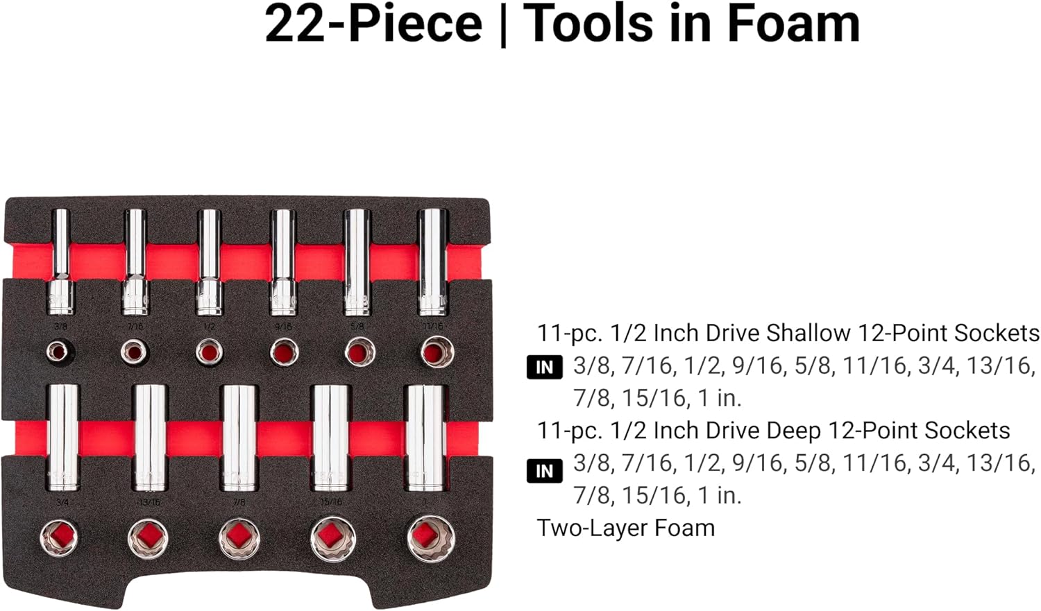 | Included Components | 11-pc. 1/2 in. drive deep 12-pt sockets: 3/8, 7/16, 1/2, 9/16, 5/8, 11/16, 3/4, 13/16, 7/8, 15/16, 1 in., 11-pc. 1/2 in. drive shallow 12-pt sockets: 3/8, 7/16, 1/2, 9/16, 5/8, 11/16, 3/4, 13/16, 7/8, 15/16, 1 in., Open top drawer and rack |