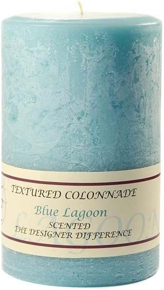 These large textured Blue Lagoon pillar candles are great for decorating with. Grouping these tall rustic candles together with our smaller sizes and some decorative accents can make an extravagant arrangement. The pouring process for these scented pillar candles makes each one unique with a rough stone like finish and a solid color. These tall pillar candles have enough fragrance in them to easily freshen up any room in your home. Lighting these rustic candles long enough for the liquid wax pool to get near the edge each time will maximize the total burn time you get out of it. Always burn candles on a candle holder to protect your table surfaces and finishes from heat damage.Fragrance DescriptionFeatures:Burn Time: 100 to 120 hoursScent: strong scented using blends of synthetic and essential oils.Wicks: lead free braided cottonDimensions: 4 in. diameter x 9.25 in. tallWax Type: paraffin