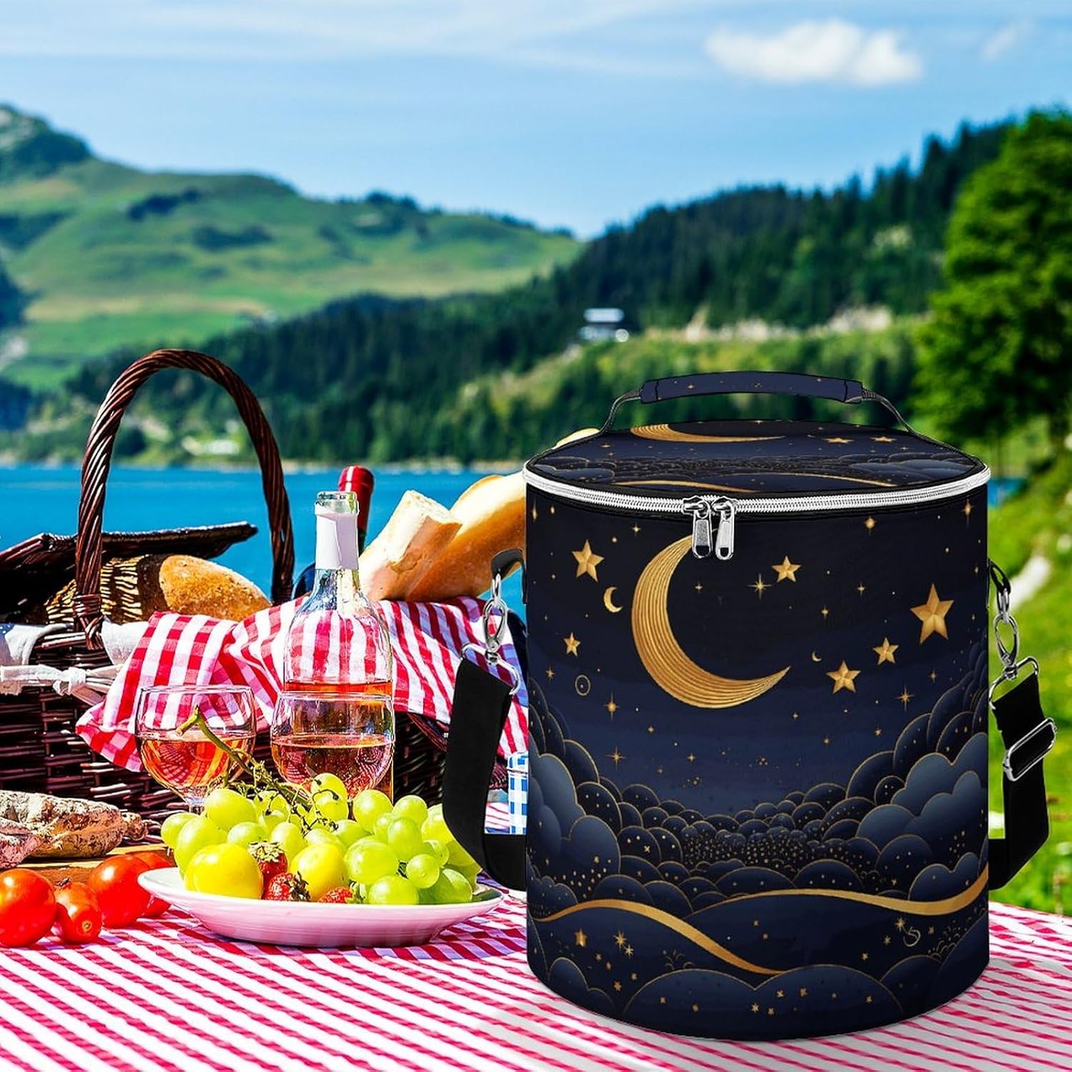 Keep Your Adventures Fresh and Mess-Free!Our There Are Stars And Moon on It Picnic Basket is designed to elevate your outdoor experiences. Whether you're planning a family picnic, a day at the beach, or a long camping trip, this bag ensures your food stays cold, your drinks chilled, and your belongings organized without any leaks.KEEPS THINGS COLD & INSULATEDConstructed with high-quality polyester and advanced insulation technology, this bag provides excellent thermal retention to protect your perishables.UNMATCHED PERFORMANCEThe leakproof design means you never have to worry about dealing with watery messes from melting ice packs again. The large, wide-opening top makes loading and unloading a breeze, and the heavy-duty zipper secures everything inside.COMFORT AND PORTABILITYWe've equipped this There Are Stars And Moon on It cooler bag with an adjustable shoulder strap to distribute weight evenly and reduce strain, even when the bag is fully loaded. The additional padded top handle offers a comfortable alternative for carrying.READY FOR ANYTHINGYour ultimate partner for adventure, this versatile tote is suited for a wide range of activities: camping, hiking, beach trips, barbecues, road trips, and daily grocery shopping. It's also a smart addition to your car emergency kit or disaster preparedness supplies.EASY TO STORE AND MAINTAINWhen not in use, its collapsible design allows for compact storage, saving precious space in your car or closet. To keep your cooler bag in great condition, we recommend hand washing or machine washing with mild detergent. Do not bleach or soak for extended periods. Allow to air dry thoroughly before storing.Size:10 x 11.8 inches / 25.5 x 30cmI wish you a pleasant shopping experience!