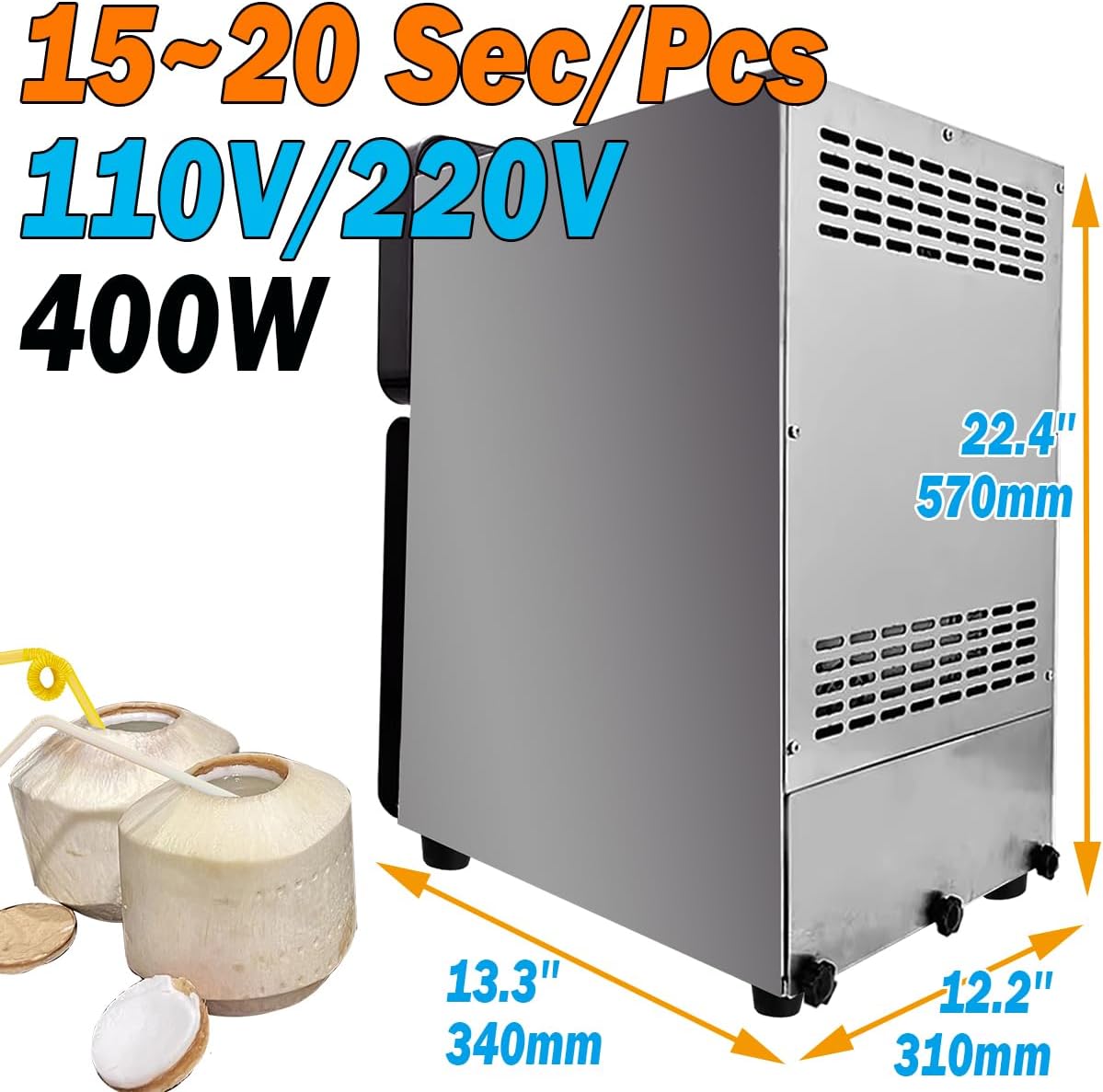 Description: 1.After drinking coconut juice and digging coconut meat, the efficiency of opening coconut is high Specification: 1.Voltage:110V/60HZ,110V/50HZ,220V/60HZ,220V/50HZ and custom voltage 2.Material: Stainless steel 3.Coconut lid machine’s Size: 12.2 * 13.3 * 22.4 inches/310 * 340 * 570mm 4.Production capacity: 15-20 seconds/piece 5.Hole diameter can be cut: 2.36inch/60MM or 2.75 inch/70mm 6.Coconut diameter: 4.3~6.29 inches/110-160mm 7.Coconut height: 4.3~6.1 inches/110-155mm 8.Power:400W 9.Color: Silver 10.Net weight: 77.175LB/35kg Feature: 1.[There are 3 buttons]:start,open,stop,easy to operate 2.[High Efficiency]:15-20 seconds high-speed coconut opening 3.[Stainless steel blade]:Easy to replace blades 4.[Advantage]:Green coconut opening machine, with smooth cutting, compact and beautiful appearance, saving time and effort Application: Suitable for wholesale use in supermarkets, shops, tourist attractions, sea view stalls, and processing factories.