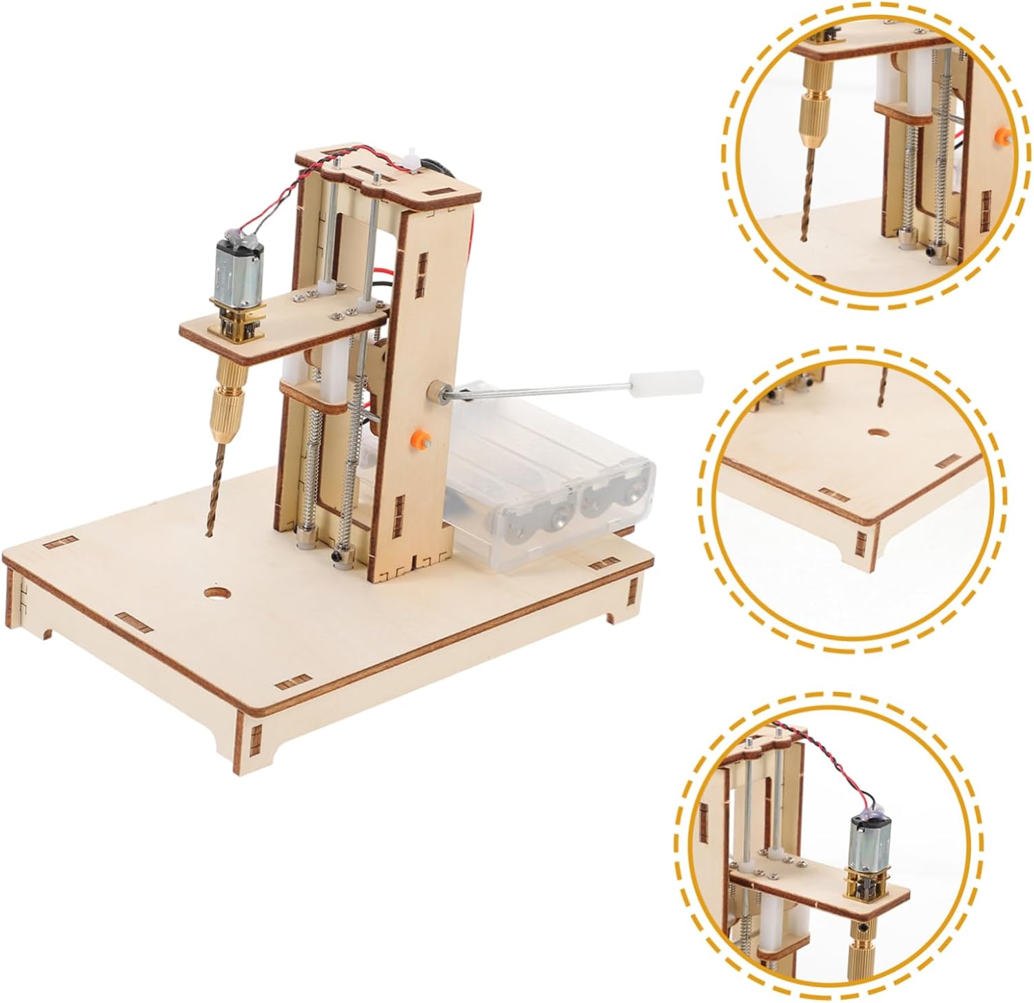 Package List 1 x set of mini drill press Characteristics -Power supply: powered by 4 AA battery(not included) DIY drill press mini. -Material:Wood mini drill press -Size:16.50X13.00X10.50cm/6.48X5.11X4.13in mini bench drill press -Color:Light Yellow household DIY drill press -By using this DIY kit, users can develop and enhance their problem-solving and critical thinking skills as they navigate through the assembly process and troubleshoot any issues that may arise mini DIY drill press. -Compact size allows for easy storage and transportation, making it convenient for users to bring it along wherever they DIY bench drill. -This product is suitable for a wide range of individuals, including hobbyists, DIY enthusiasts, who can all benefit from the hands-on learning experience Desk Bench Drill diy. -The DIY material kit is not only convenient but also provides an educational experience, allowing users to learn and explore various concepts while assembling the machine wood bench drill press. -The mini drilling machine is ideal for DIY making, providing users with precise and accurate drilling capabilities mini wood bench drill press.Goods DescriptionDIY Mini Drill Press Kit With the DIY Mini Drill Press Kit, you’ll be able to complete a wide range of projects with ease.mini drill press Your mini drill press will quickly become one of your go-to tools.projects mini drill press Stable design provides more precise drilling results
