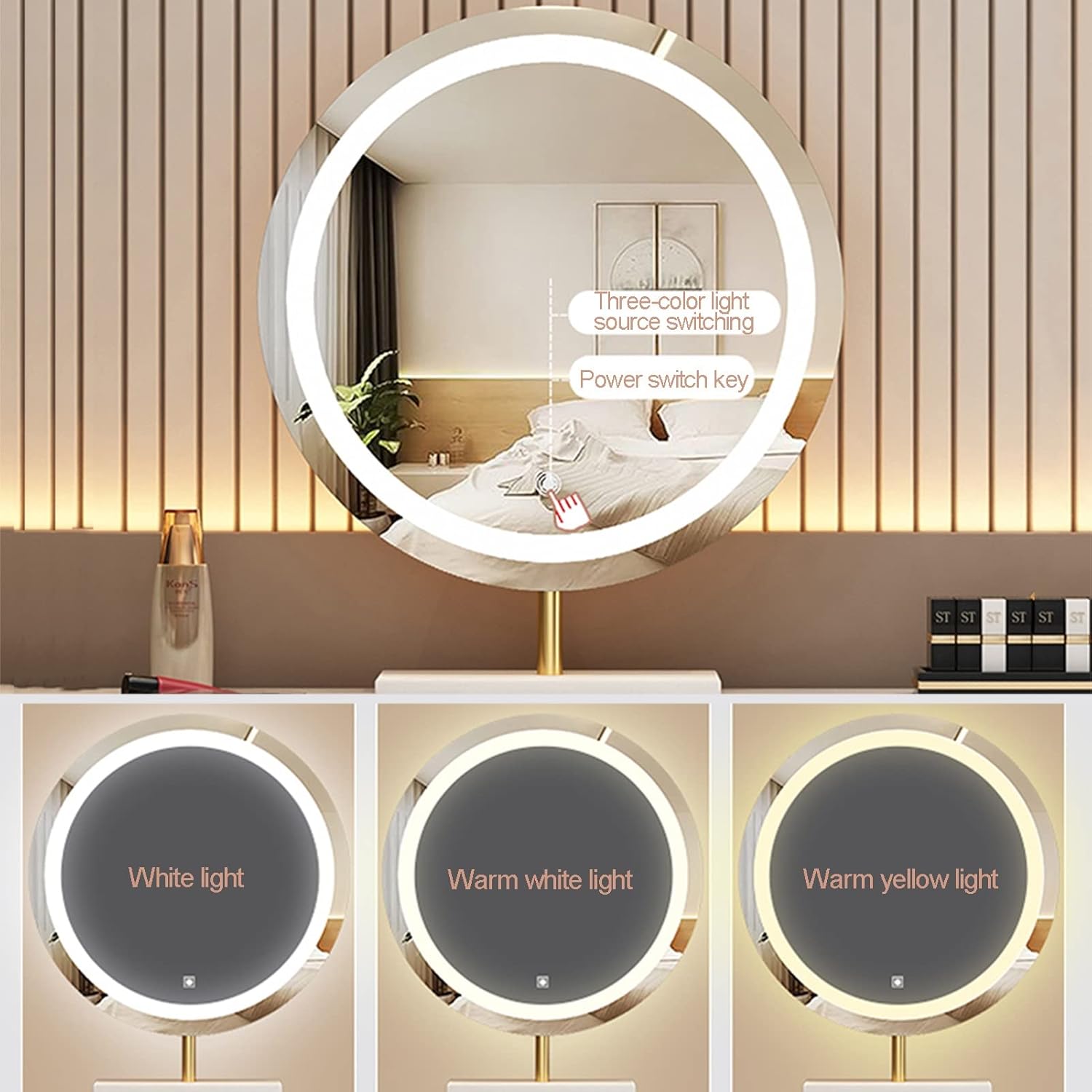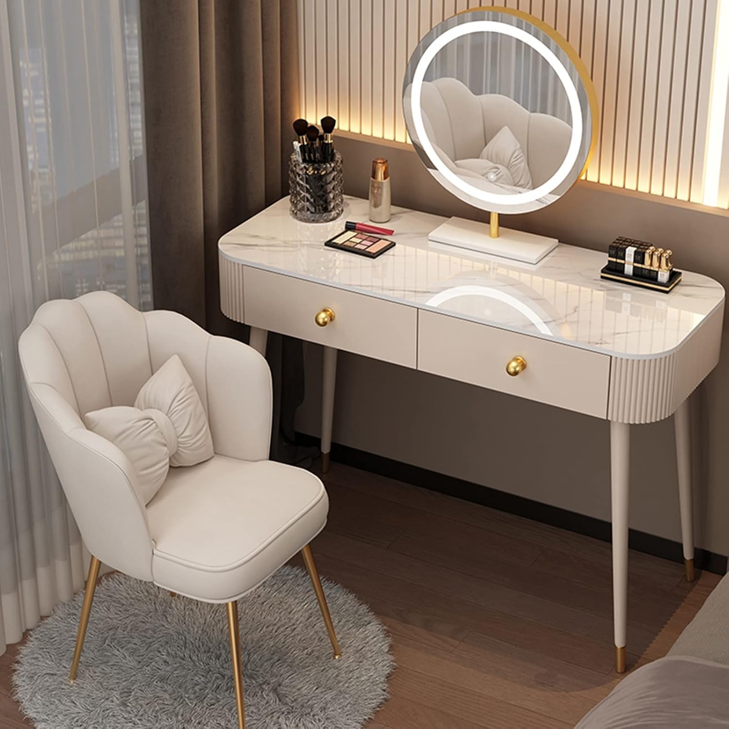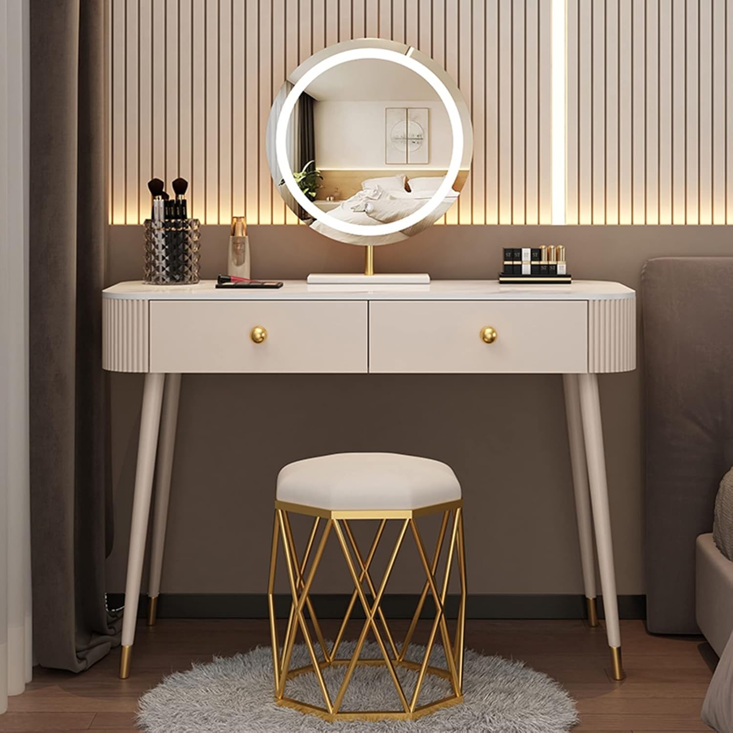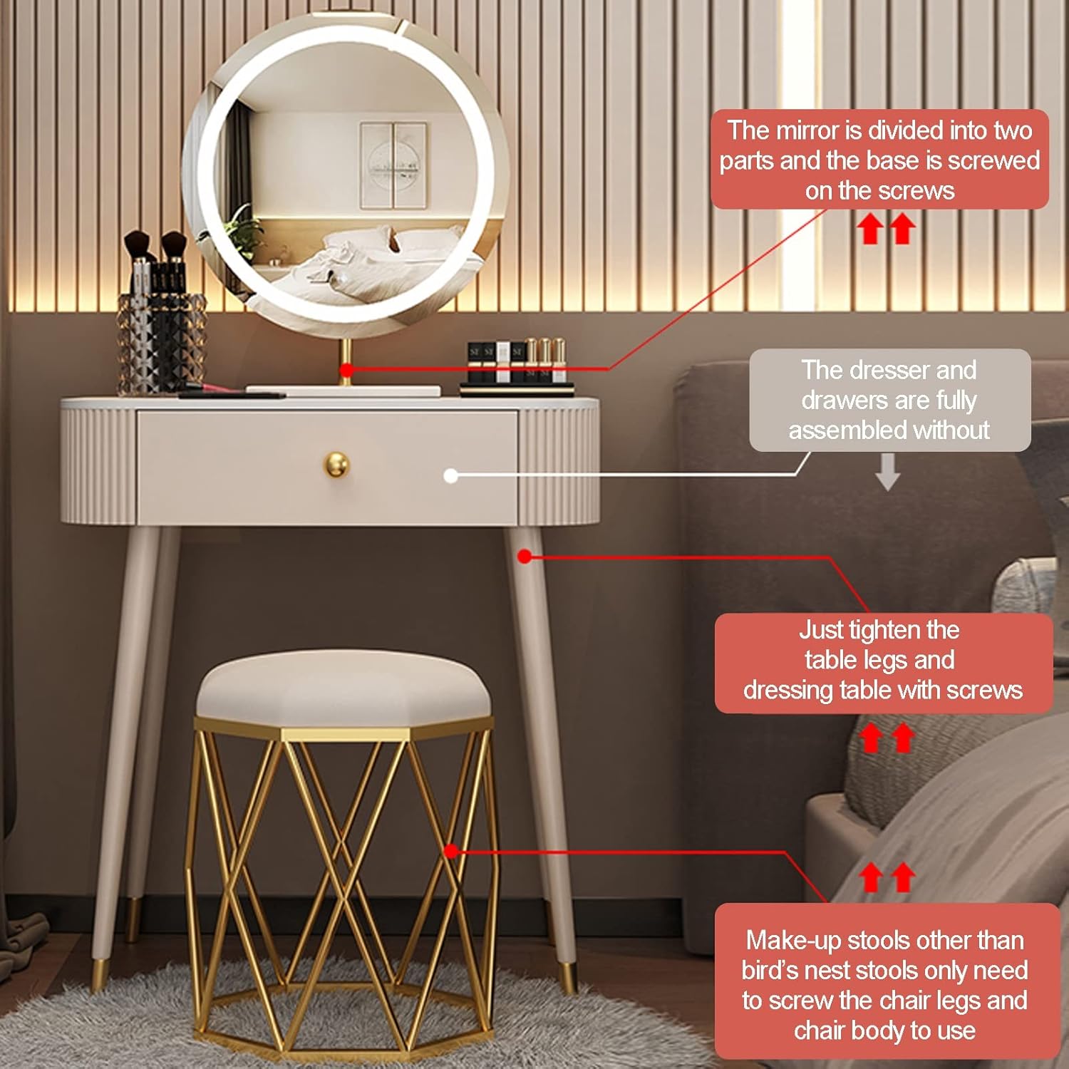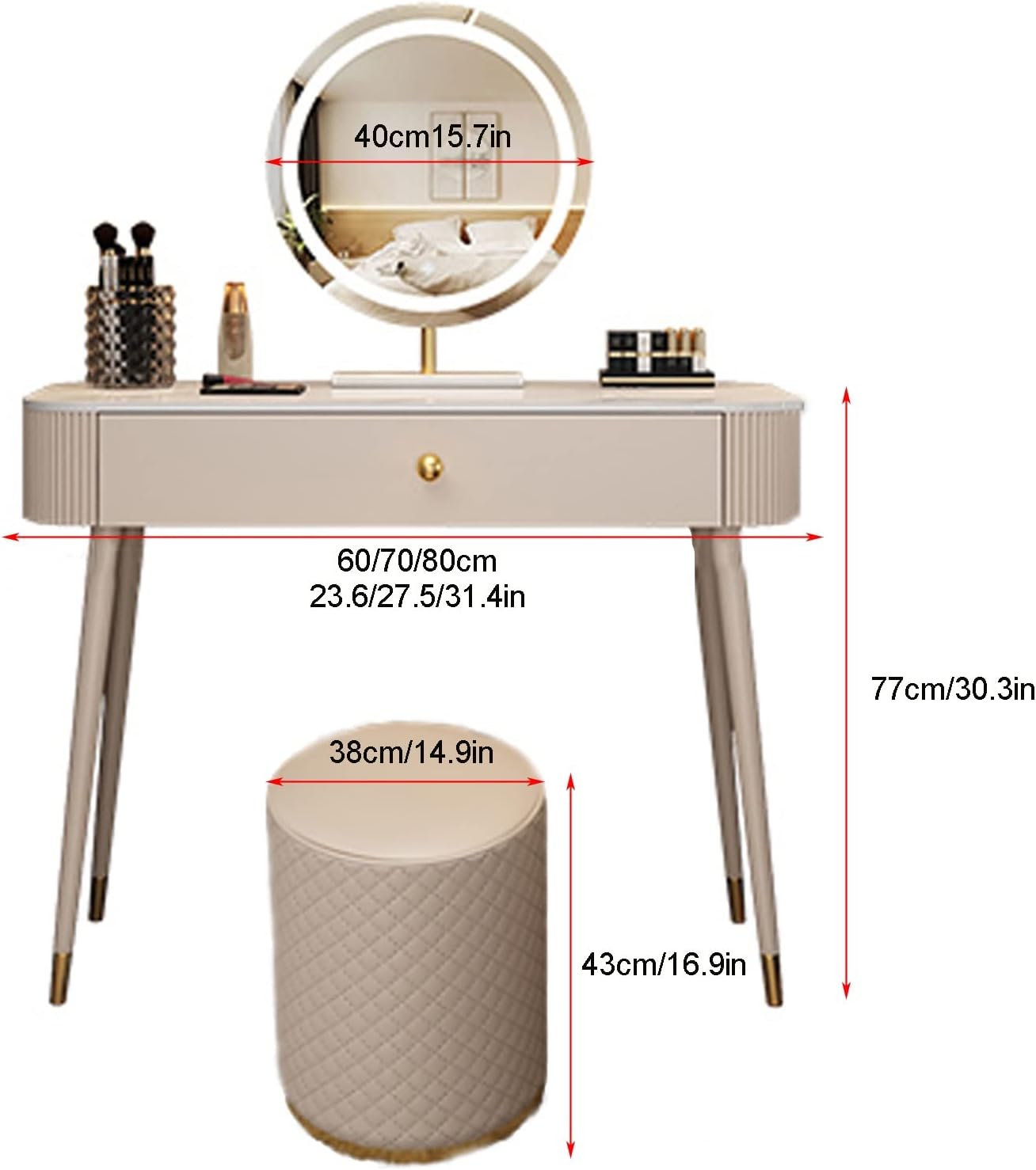 ☀ Vanity mirror with lights features spacious drawers, it can hold all your cosmetics and jewelry perfectly and make your everyday beauty routine easier and faster. ☀ YQMHEZ Make up vanity are very bright and comes with 3 modes of the lighted mirror(white, warm white, warm yellow), adjust the brightness according to different scenes and makeup needs, simple and fast. ☀ You only need to assemble the legs and mirror to the main body which has been assembled already by us. This noble makeup vanity with lights will definitely add an elegance to the room. It will be a ideal gift for your beloved one on a birthday, Valentine’s day, Mother’s day and Christmas!►Specification:* Color: White* Material: MDF + iron* Table length: L60cm/23.6in, L70cm/27.5in, L80cm/31.4in, L100cm/39.3in* Vanity Mirror size: 40cm/15.7in* 3 Light Colors: White Light, Warm White Light, Warm Yellow Light* Assembly Required: Yes* Package Contents:1 x Vanity Table, 1 x Mirror, 1 x Soft Cushioned Stool►Note:1. We are manually measuring, there may be an error of 1 in, please prevail in kind.2.The color may exist a slight difference due to different screen displays.3. If you have any questions, you can contact us by email, we will reply you within 24 hours.