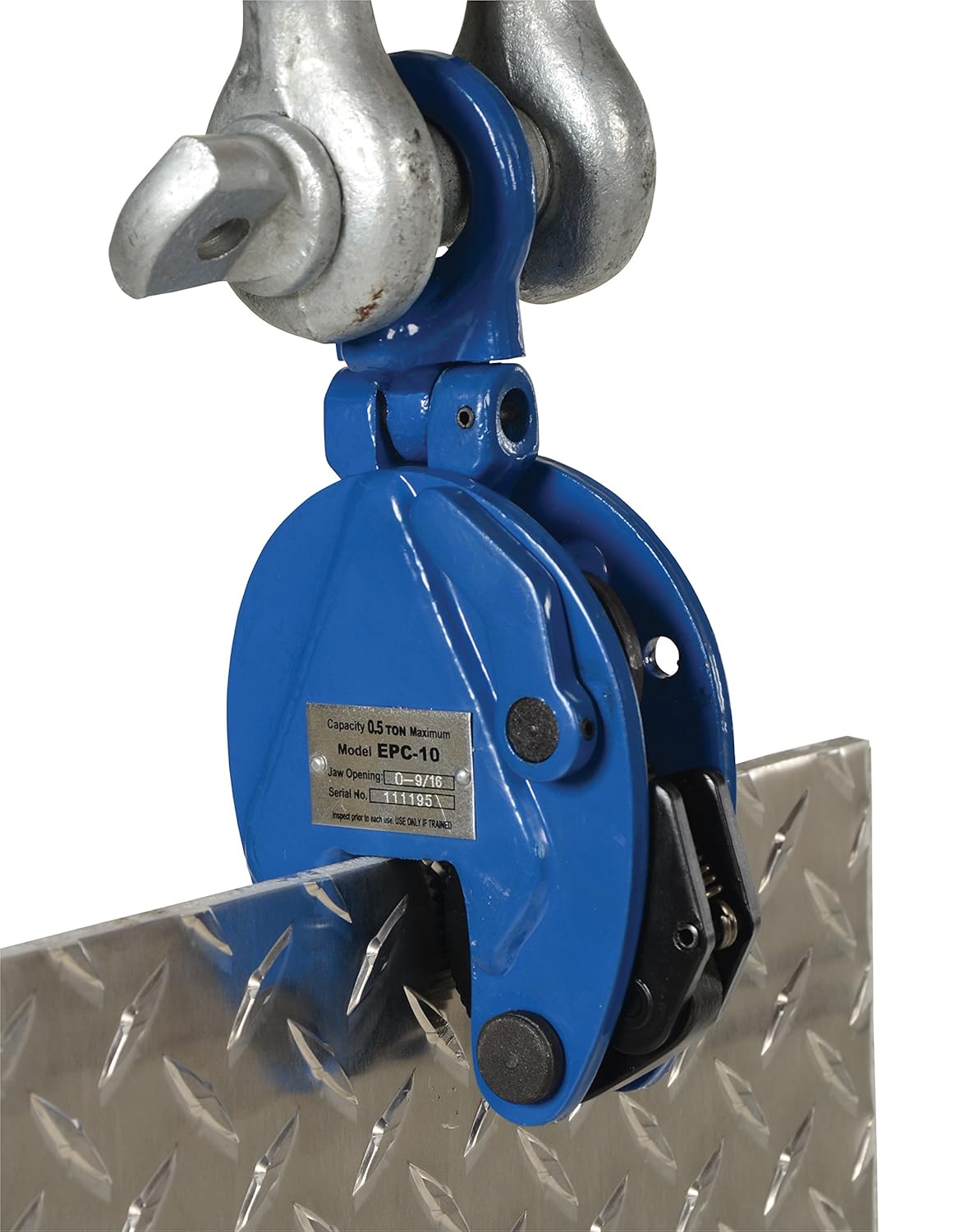Pivoting bale for easier and more versatile operation. Automatic serrated hardened steel cams and pads. Drop-forged steel case for maximum strength. Designed to meet ASME B30.20. Warning: Do not exceed the working load limit. Serious bodily injury or property damage may result. 200 lbs minimum plate weight. 1.6" Throat depth. Not designed to use on stainless steel or aluminum plates. For use with materials with a surface hardness to 30 RC (300 HB).