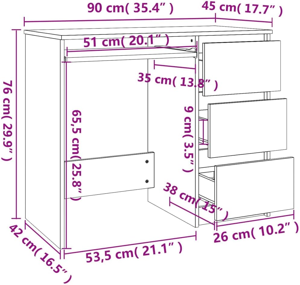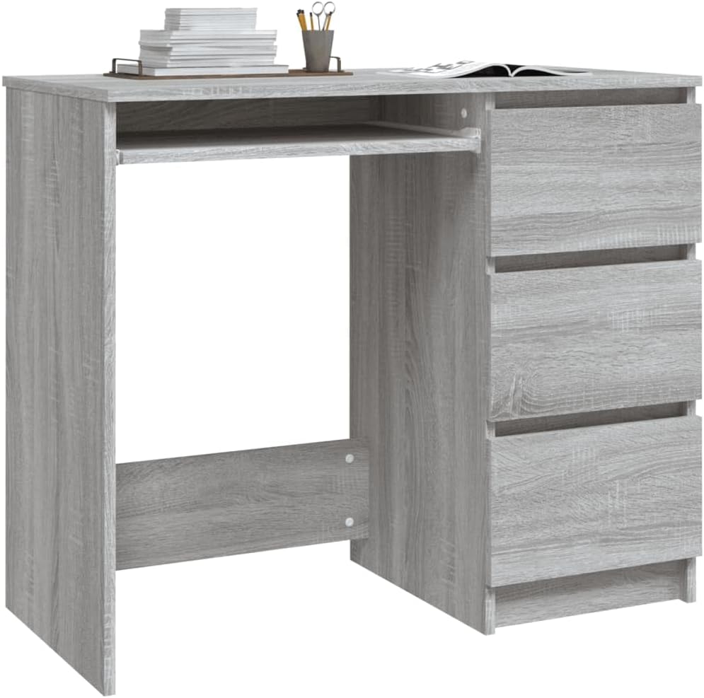 Introduce an air of elegant charm into your study or working area with this sleek and modern desk!Premium material: The engineered wood is of exceptional quality with smooth surface and also features strength, stability and resistance to moisture.Ample storage space: With 3 drawers, the office desk provides ample space for placing your books, folders and documents.Sturdy tabletop: The sturdy tabletop provides a secure surface to place your computer, laptop, photo frames, decorative objects, potted plants, etc.Easy cleaning: The standing desk is easy to clean with a damp cloth.Colour: Grey sonomaMaterial: Engineered woodDimensions: 90 x 45 x 76 cm (L x W x H)With 3 drawersAssembly required: Yes
