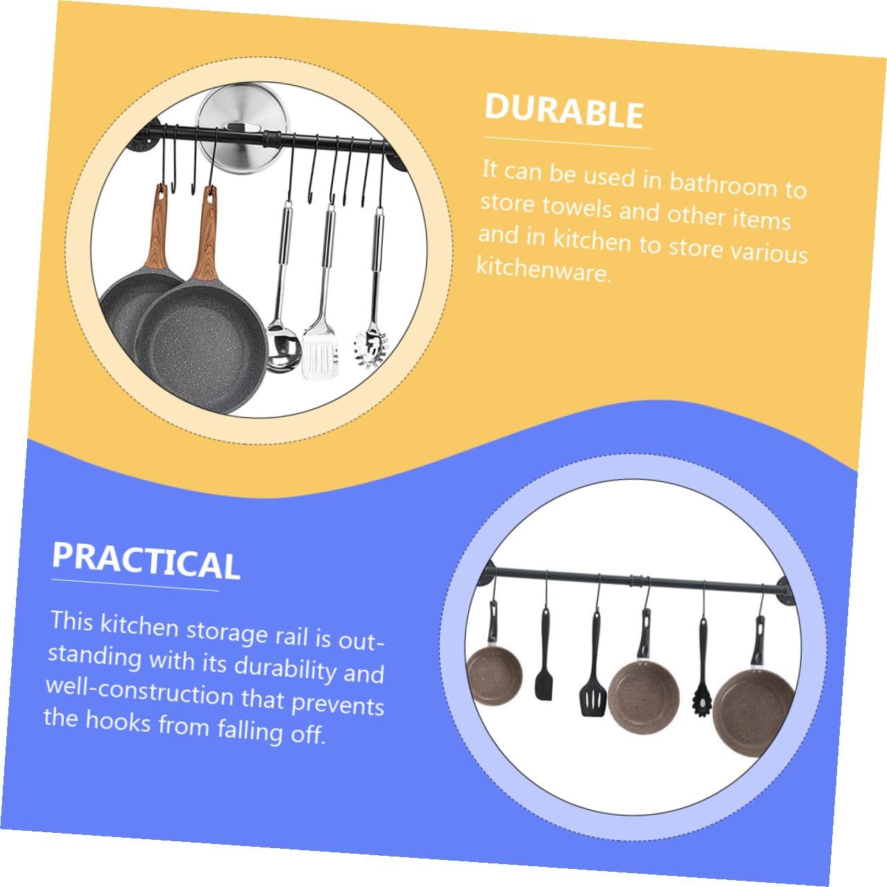 Package Include 2 x rods 2 1 x connector 2 x bases 8 x screws 8 x expansion tubes 6 x hooks Characteristics - Size: 60.00X13.00X5.00cm/23.58X5.11X1.97 inch. - Color: Black. - Material: Iron. -Product Info:Pot lid stand - Great for storing and organizing pots, pans, kitchens utensils and keeping all within hands reach pot pan rack. - This kitchen organization and storage unit will let with your supplies, not around them. Mount it under your kitchen cabinet or above the wall on your coffee machine to organize your kitchen with ease Hanging Pot Pan Organizer. - Hangs your kitchen accessories, measuring cups, silicone spatulas, cookware set, coffee mugs and more to the hooks that easily slide. pot hanger - Fine workmanship and creative appearance its popularity and practicality wall-mounted utensil holder. - Use it as kitchen organization unit for cooking utensils, as a bathroom organizer to hangs your towels, or in your entryway for hanging coats, bags and keys. Also, it can be a perfect rack for hanging your medals to the wall hooks utensil wall holder.Goods InformationHanging Pot Pan Organizer It is made of premium iron material, for use.kitchen wall rack This is a pot rack.kitchen utensil hanger Designed with hooks, this storage hooks can be used to spatulas, pots, pot lids, washing cloths, etc.kitchen utensil holder rack Installed with screws, this storage rack can hold heavier items, such as frying pot