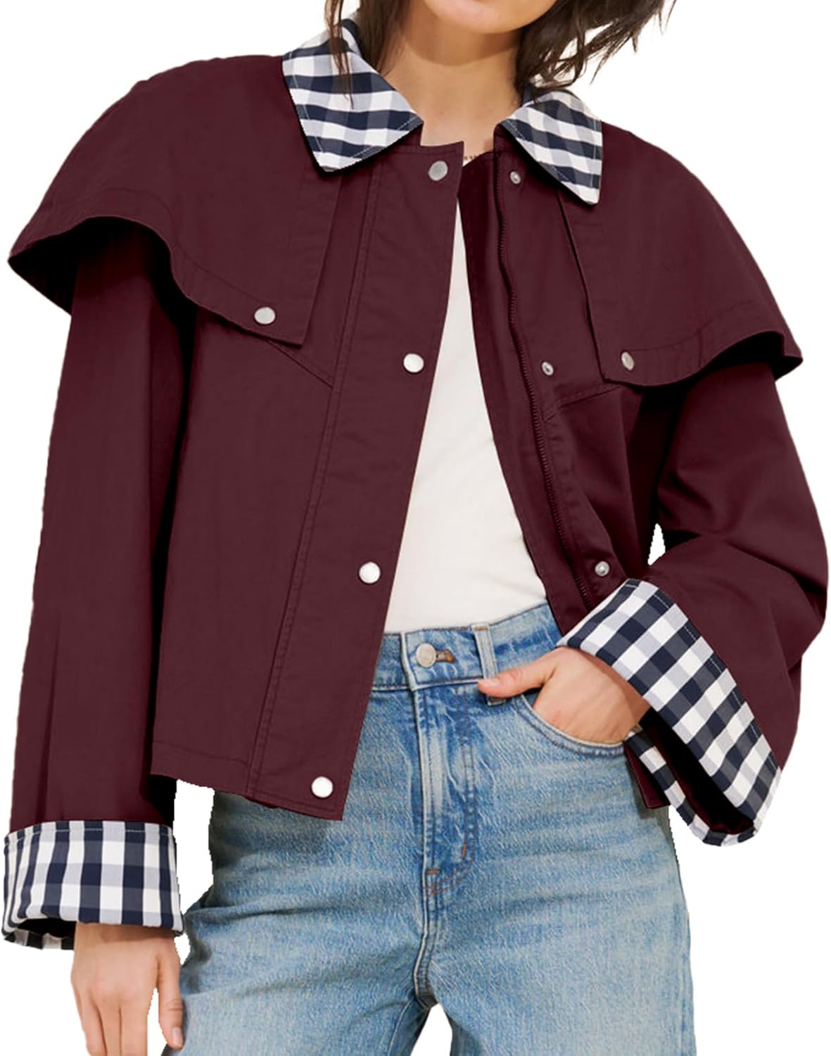 | Embellishment Feature | Gingham trim, Long Sleeve, Solid Color, Business Casual, Cape Style Jacket, With Pockets, Lapel Collar, Cropped Trench Coat |