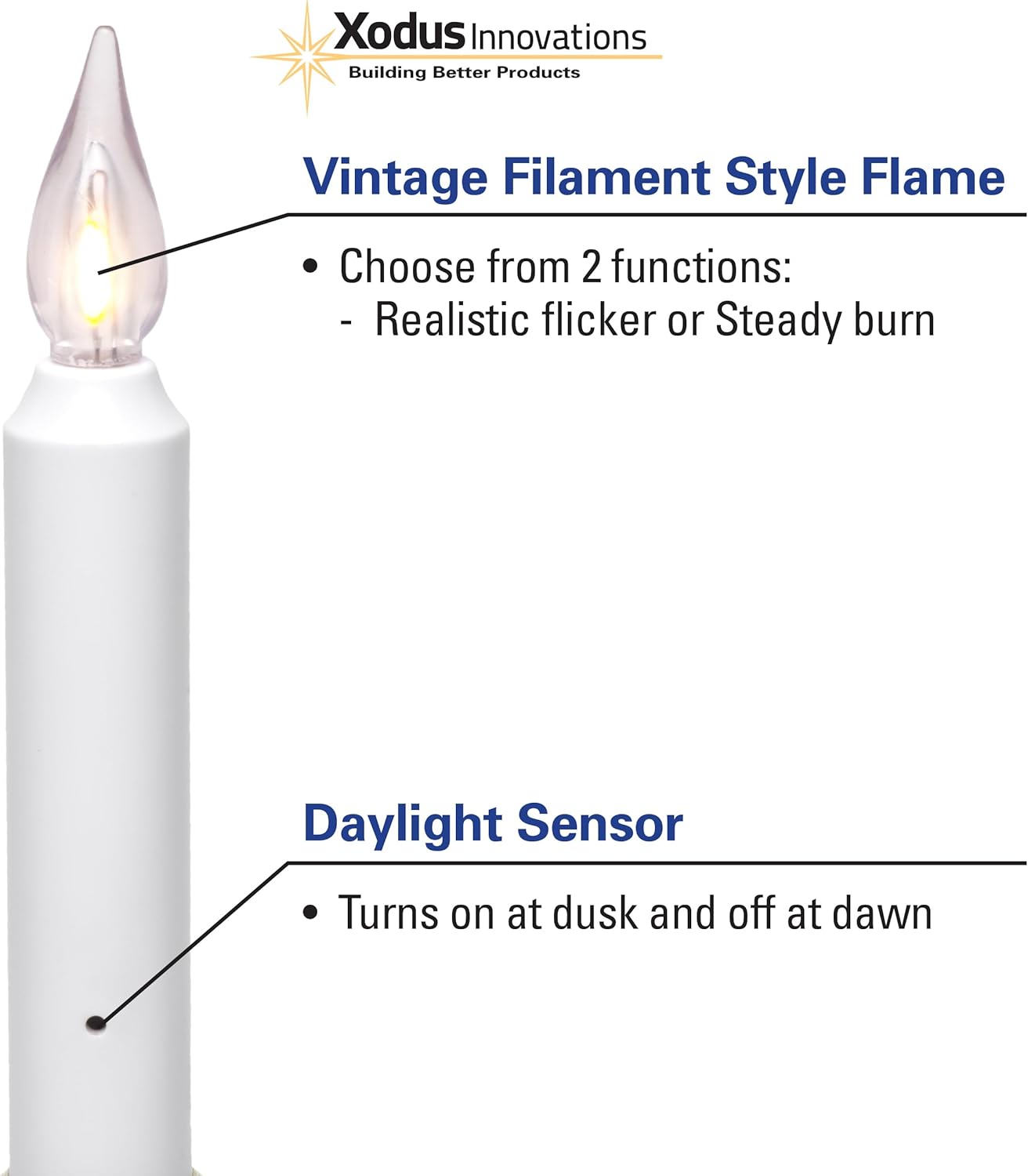 Illuminate your windows safely and cheerfully with these 4 vintage filament LED window candles. Battery operated for a clean, wireless look; this classic-style ivory taper has three flame settings: off, steady on flame or flickering light and has a handsome sculpted candle holder. A discreet automatic sensor turns the candles on at dusk and off at dawn so it's effortless to use, and unlike an incandescent bulb, the LED bulb stays cool for worry-free lighting all night long. Each candle uses 2 AA alkaline batteries (sold seperately) Batteries will last 40 days when lit for 12 hours on per day. Candle measures 8.5 inches high x 4 inches wide x 1.75 inches deep. For indoor use only. Great for window sills since it's less than 2 inches deep.