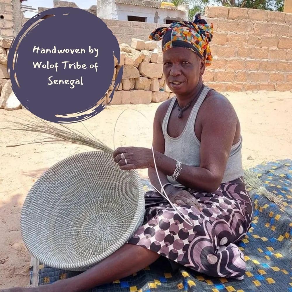 Transform your space with this exquisite handwoven African basket, masterfully crafted by skilled artisans in Senegal. The striking yellow and white pattern creates a modern aesthetic while maintaining traditional weaving techniques. This versatile piece serves beautifully as a laundry hamper or storage solution for toys, blankets, and towels. The sturdy round design features convenient rope handles for easy transport and a matching lid that adds both functionality and style. The substantial size offers generous storage capacity while the intricate weave pattern ensures durability for everyday use. Perfect for any room in your home, these baskets combine practical storage with authentic artisanal craftsmanship. The natural materials and timeless design make it an elegant addition to your home decor while keeping your belongings organized and concealed. Each basket showcases the distinctive handiwork of Senegalese artisans, making it not just a storage solution, but also a unique decorative piece that tells a story.
