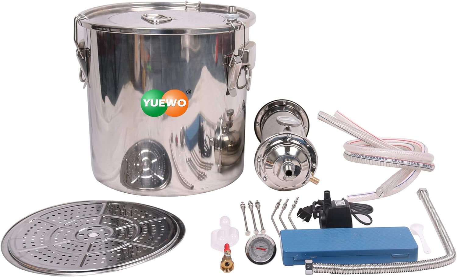 Thanks for shopping in our store, we are a professional business company. We YUEWO have over 8 years experience in the online business. We always provide the best products and service! Contact us anytime when you need additional help! Moonshine alcohol water distiller complete set of moonshine still, great for both beginners and experts, very easy to set up and use. It can be used for distilling seawater, steam and alcohol. Specification: Material: 304 stainless steel Capacity: 20L/30L/40L (5.2Gal/8Gal/10.6Gal) Scope of application: distilled liquor and wine, extract pure dew, distilled water. Guarantee quality: 24 Months Warranty Heat source: gas stoves, induction cooker, ceramic stoves, electric coil stoves, firewood, etc. Note: Use before or after, pour water into steaming barrel, heating, and distilling half an hour to an hour, can remove residual impurities in the copper tube. (Don't add cold water into the small barrel) In order to avoid appear oxide. Dry barrel with a towel and put it in a dry place when work finished.